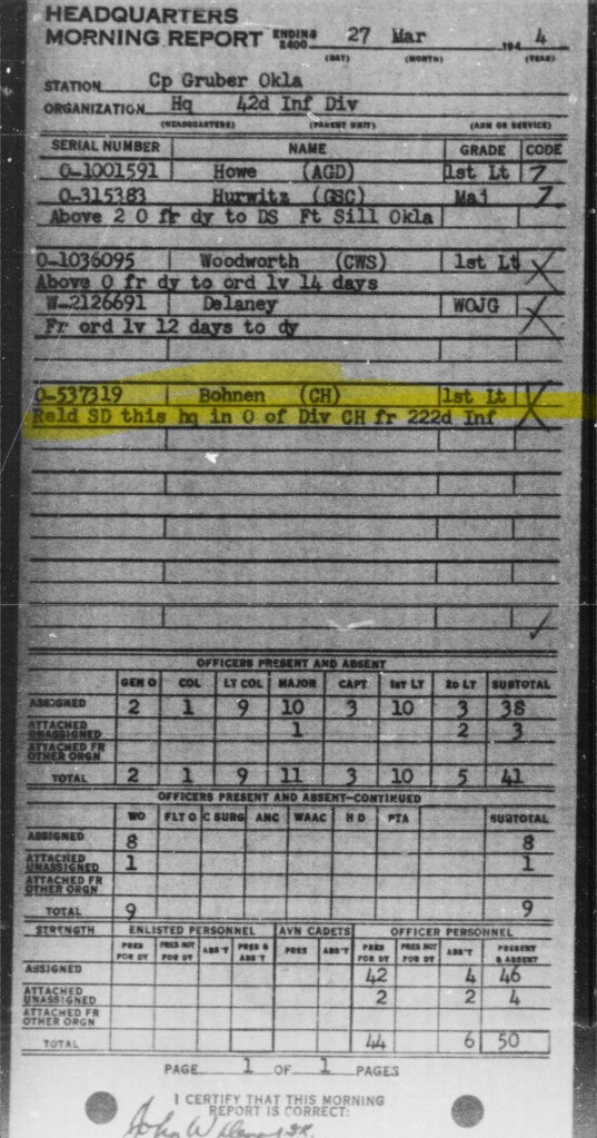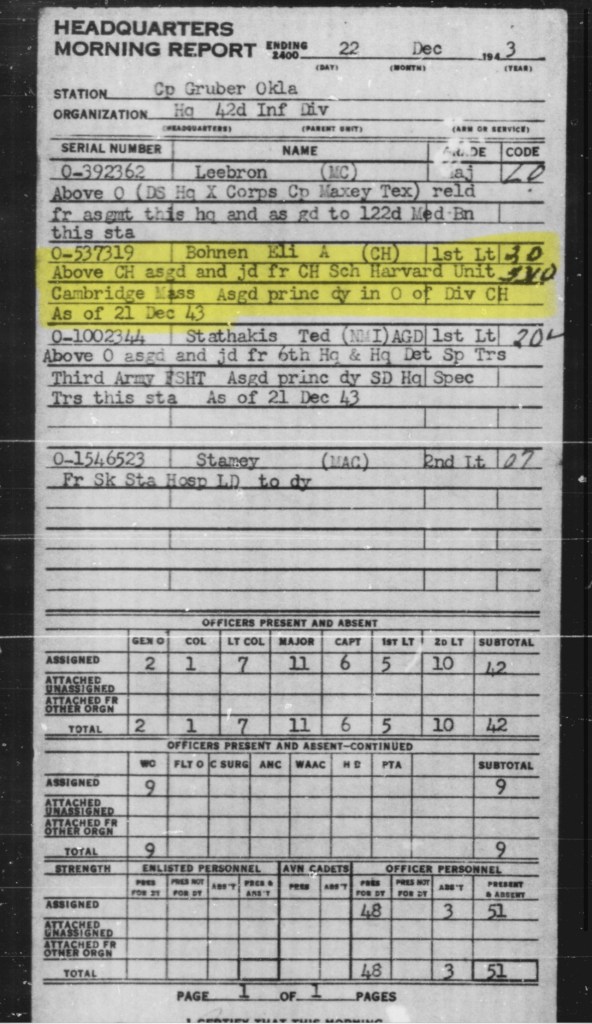 Rabbi Bohnen would go on to serve as a Jewish chaplain with the 42nd Infantry Division, known as the “Rainbow Division,” during its European campaign in the final months of the war. After arriving overseas in late 1944, he moved with the division through France and into Germany, providing religious services, counseling, and spiritual support to Jewish soldiers under combat conditions. His responsibilities included conducting worship services when circumstances allowed, assisting soldiers coping with combat stress, and helping Jewish troops observe religious traditions amid active operations.