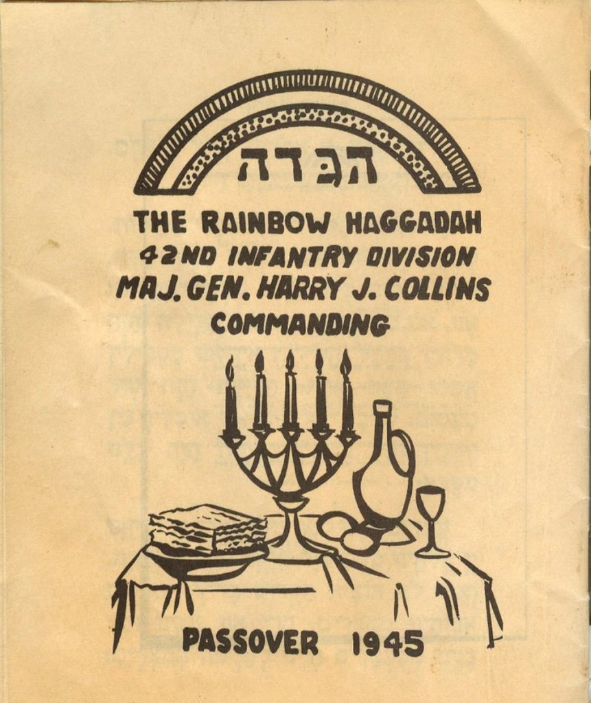 Major General Harry J. Collins, commanding general of the 42nd ID, who referred to Rabbi Bohnen as “Padre” and was notably fond of him, approved the idea and authorized two trucks to gather supplies. These included food, wine, and a small prayer book known as a Haggadah, used to guide the Passover Seder. Rabbi Bohnen and his assistant, Chaplain Eli Heimberg, used the Haggadah along with an old mimeograph machine—documented as having been cleaned with two German flags by Bohnen—to print more than 800 copies of a customized version that became known as the “Rainbow Haggadah.” Approximately 1,500 soldiers attended the Seder, nearly double the number of books produced.