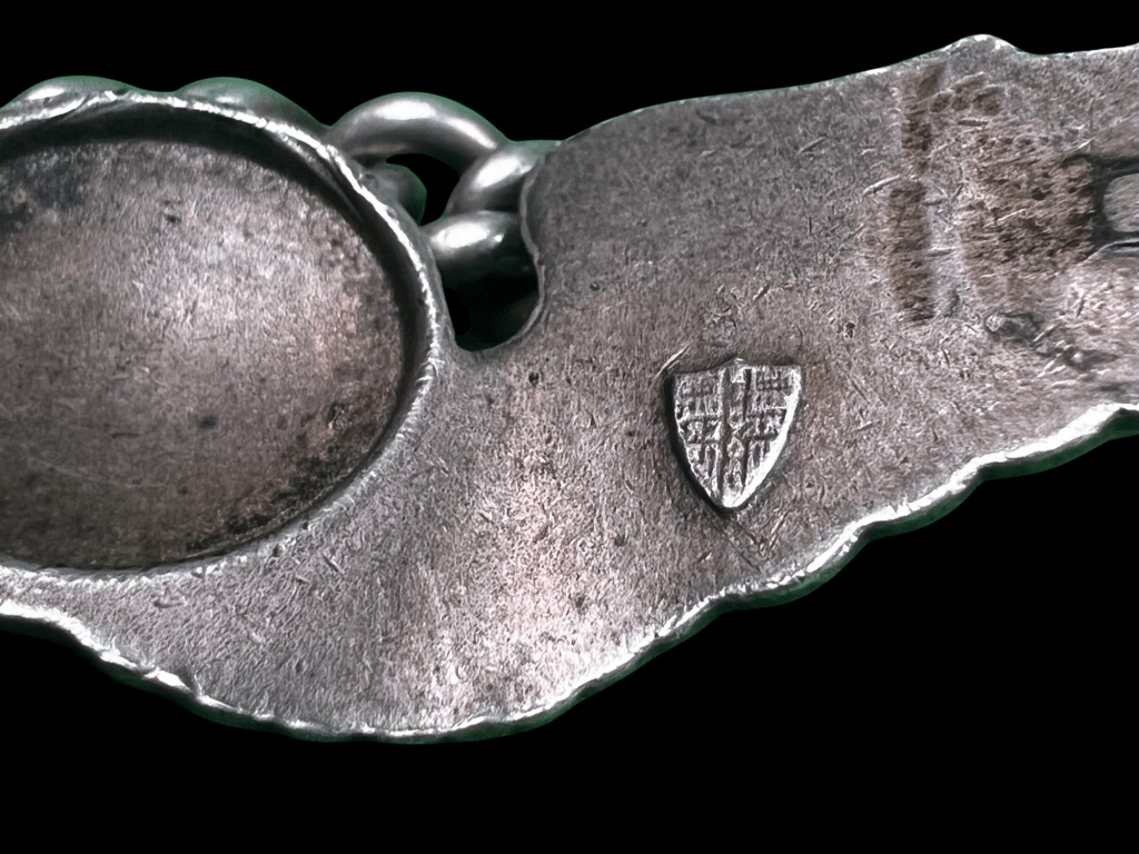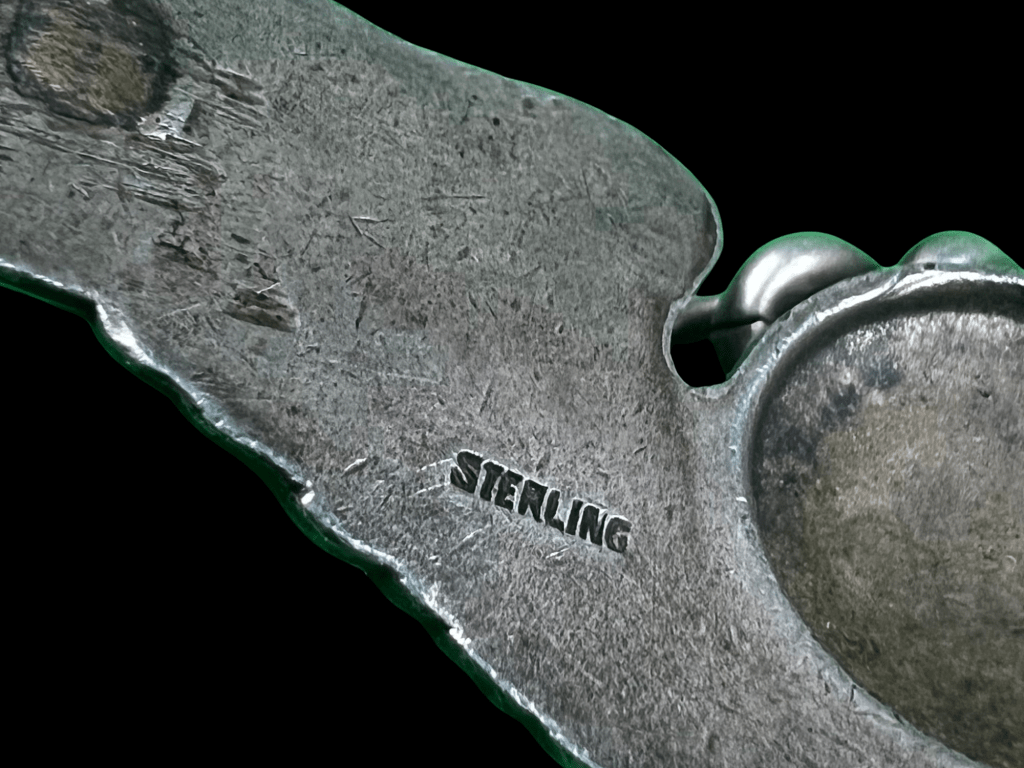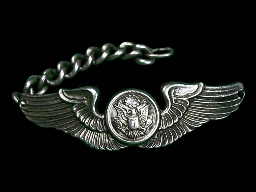 World War II sterling silver bracelet featuring U.S. Army pilot wings, marked “MS Meyer Inc Standard.” An example of wartime trench art, where service members repurposed military items into personal keepsakes. The bracelet band is missing much of its original form, but the wings and markings remain intact.