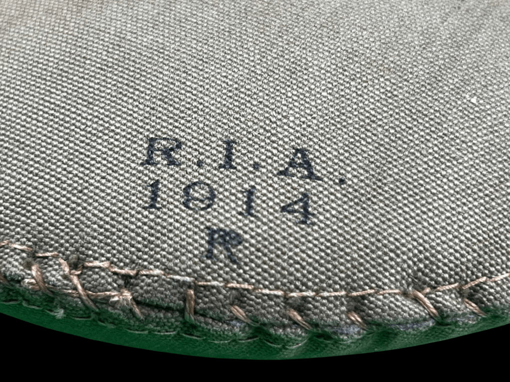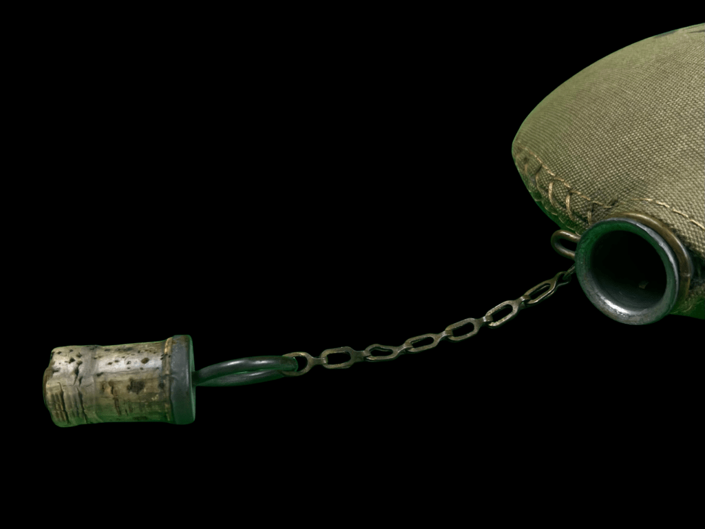 U.S. M1903 canteen, marked “RIA 1914” and featuring “IOWA” on the front, likely issued to the Iowa State Guard. Retains its original cork and chain. This model was used extensively by U.S. military and state militia forces during World War I before the adoption of the M-1910 canteen.