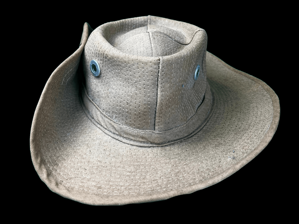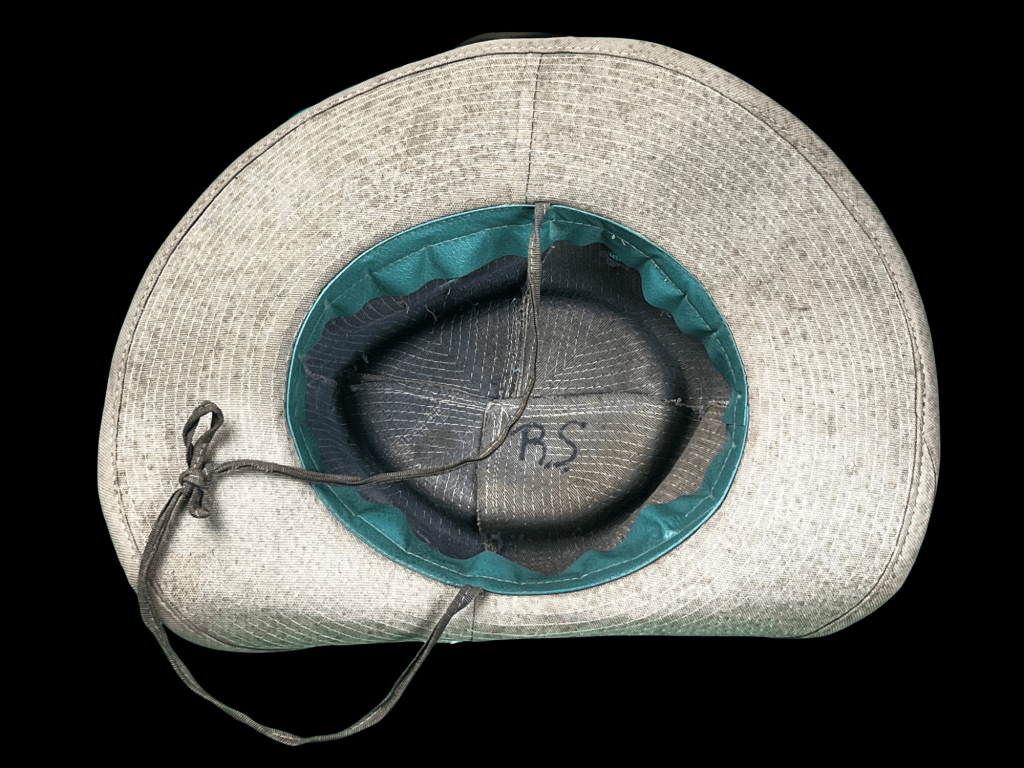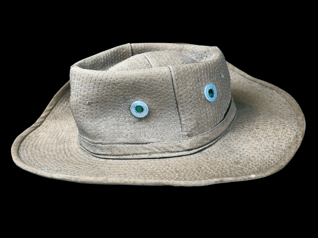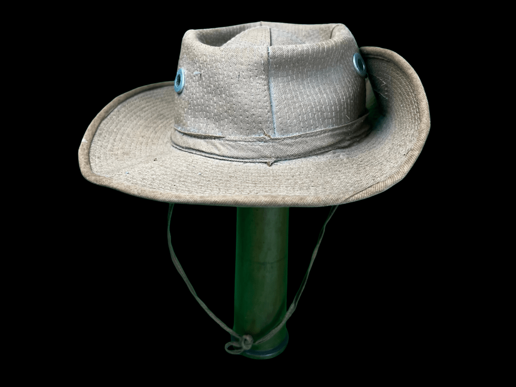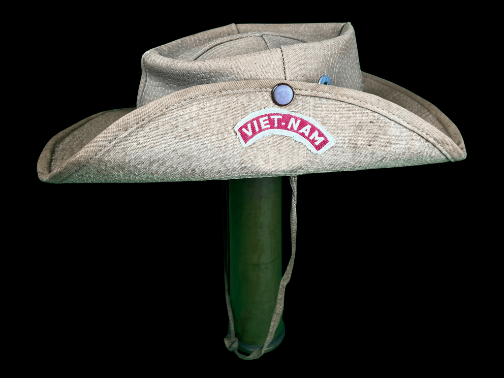 Original Vietnam War U.S. and South Vietnamese bush cap with the “Viet-Nam” scroll tab patch sewn to the front. Made of cotton with a soft, wide brim, the cap reflects the standard construction and design of issued bush caps. These were worn by enlisted soldiers and officers in the field for general utility, sun protection, and comfort during operations in Vietnam’s tropical climate.