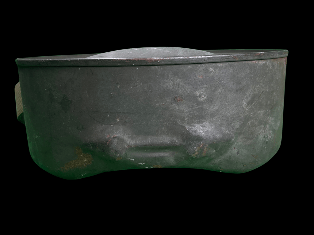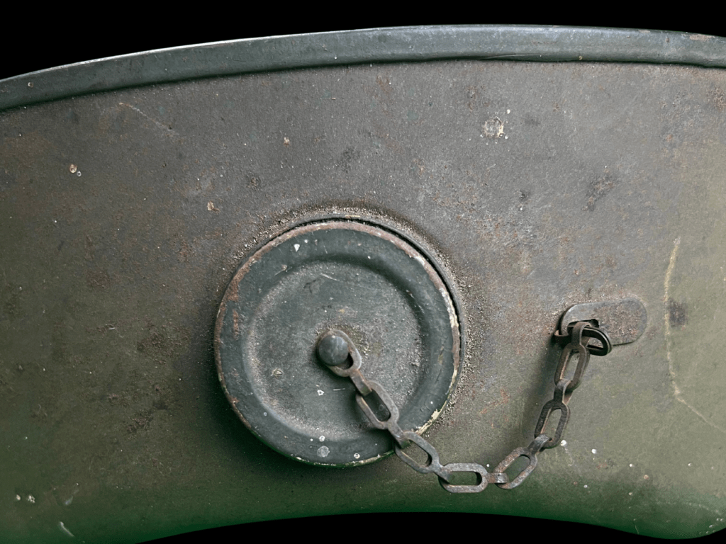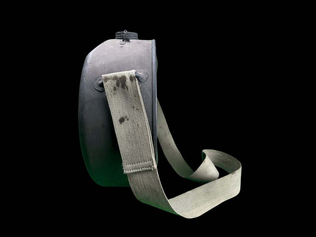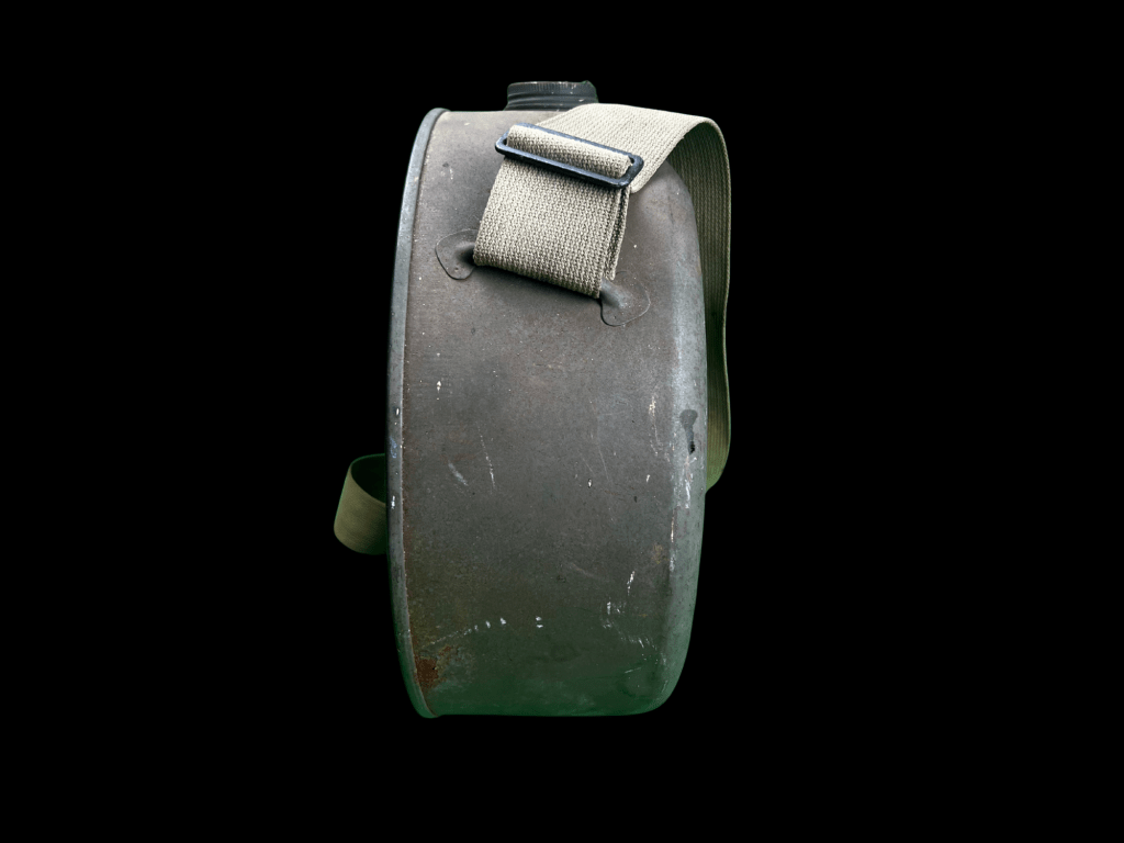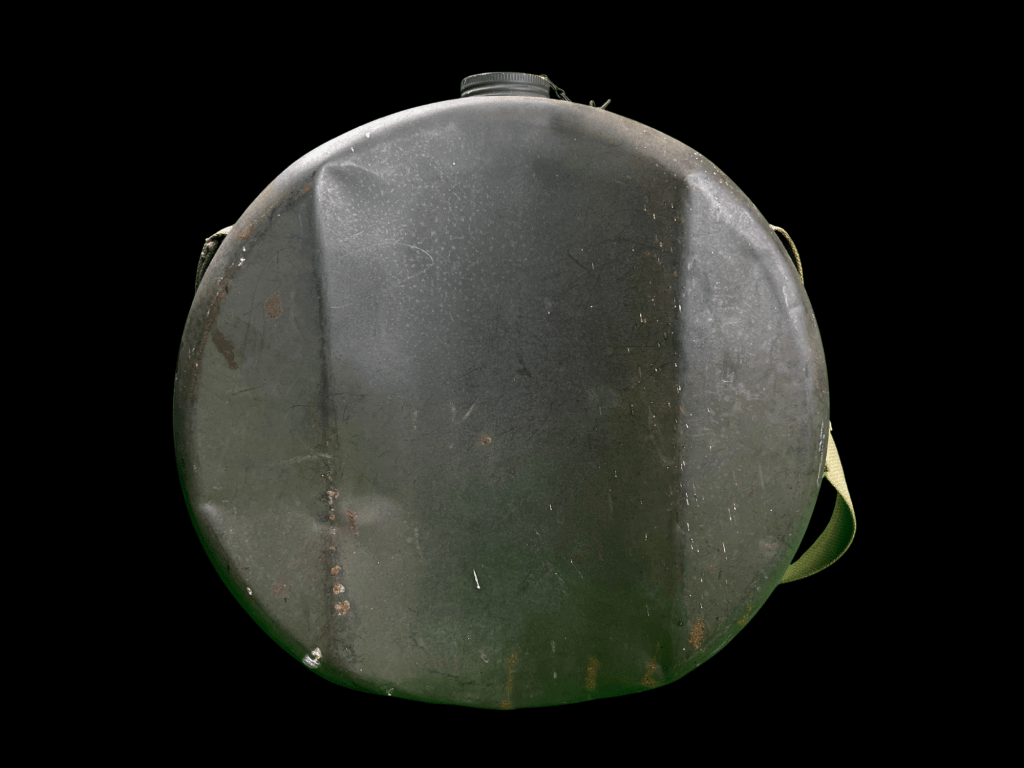 Original World War II U.S. Army 2‑gallon canteen, produced for field hydration and larger unit water supply needs. Introduced early in the war, these canteens were used in campaigns such as North Africa where extended water capacity was critical. Some examples were reportedly repurposed in the field to help cool down machine guns during sustained fire.