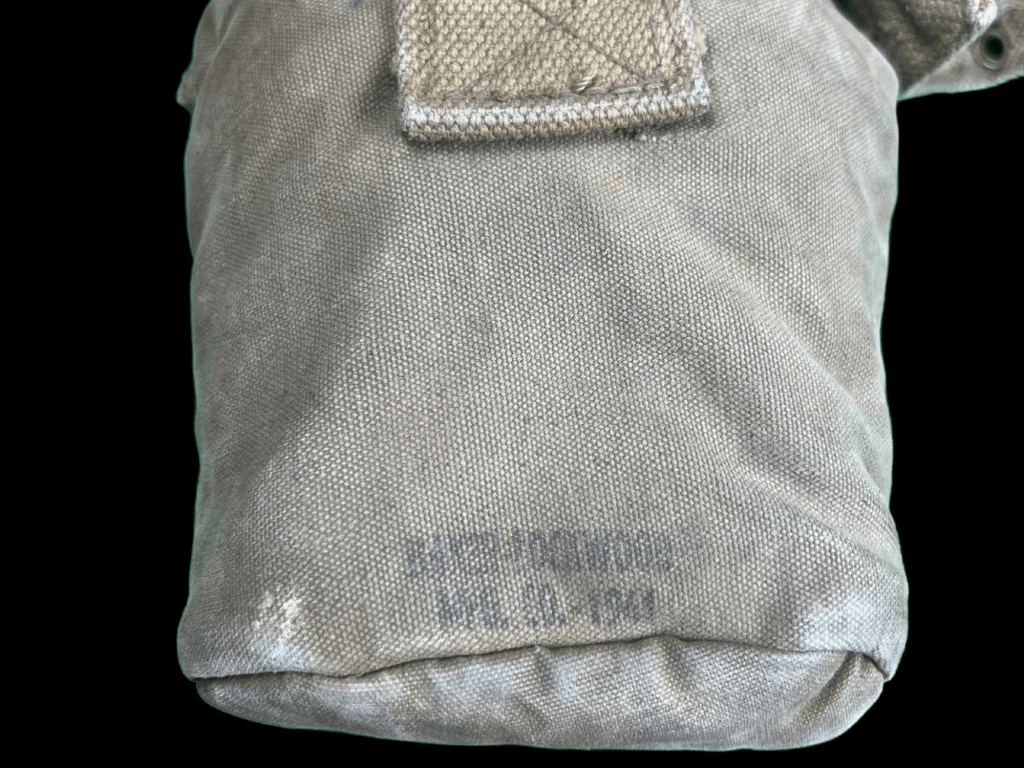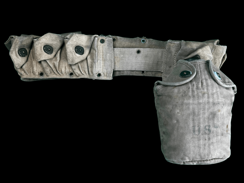 Original World War II setup featuring a British-made 1943 utility belt by M.E. Co., paired with a 1941 U.S.-made canteen manufactured by Baker Lockwood MFG. Co. The belt is a standard U.S.-pattern design with attachment points for holsters, pouches, and other field equipment, made in Britain.