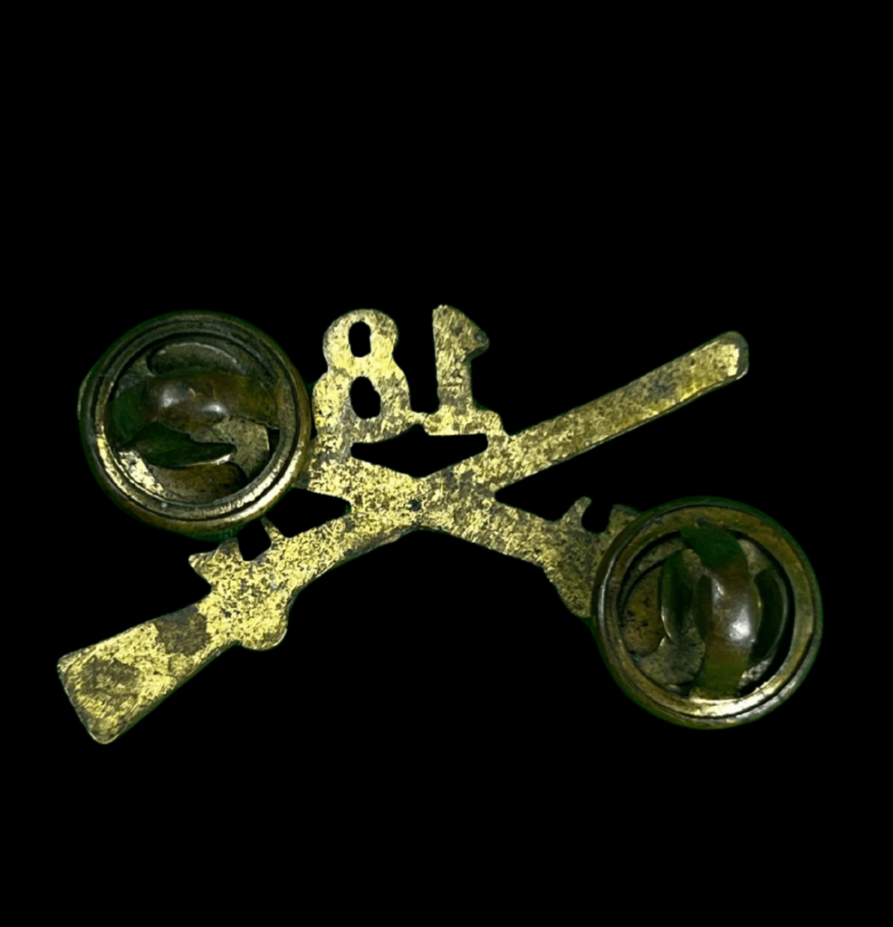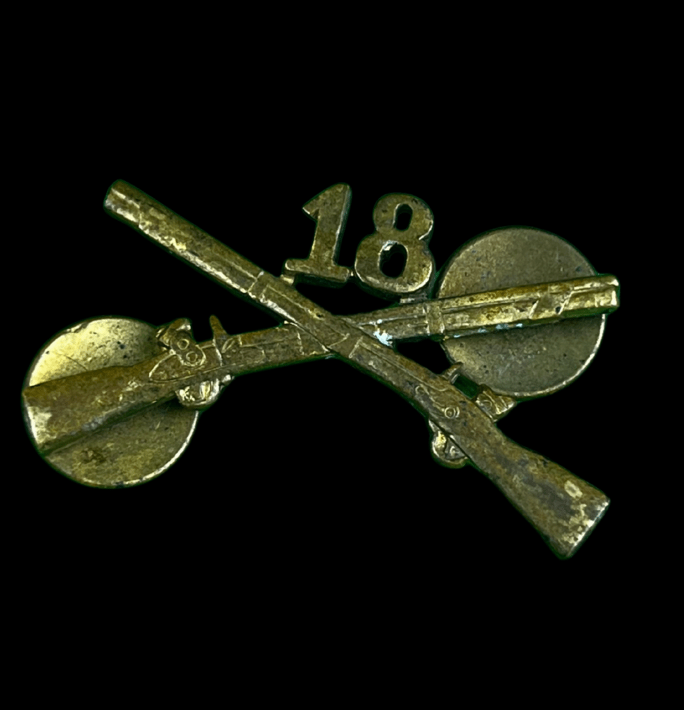 Original World War II U.S. 18th Infantry Regiment lapel pin. The 18th Infantry Regiment is notable for its role in the D-Day landings on June 6, 1944, serving on Omaha Beach as part of the 1st Infantry Division. Pins like this were worn on dress uniforms to show unit affiliation.