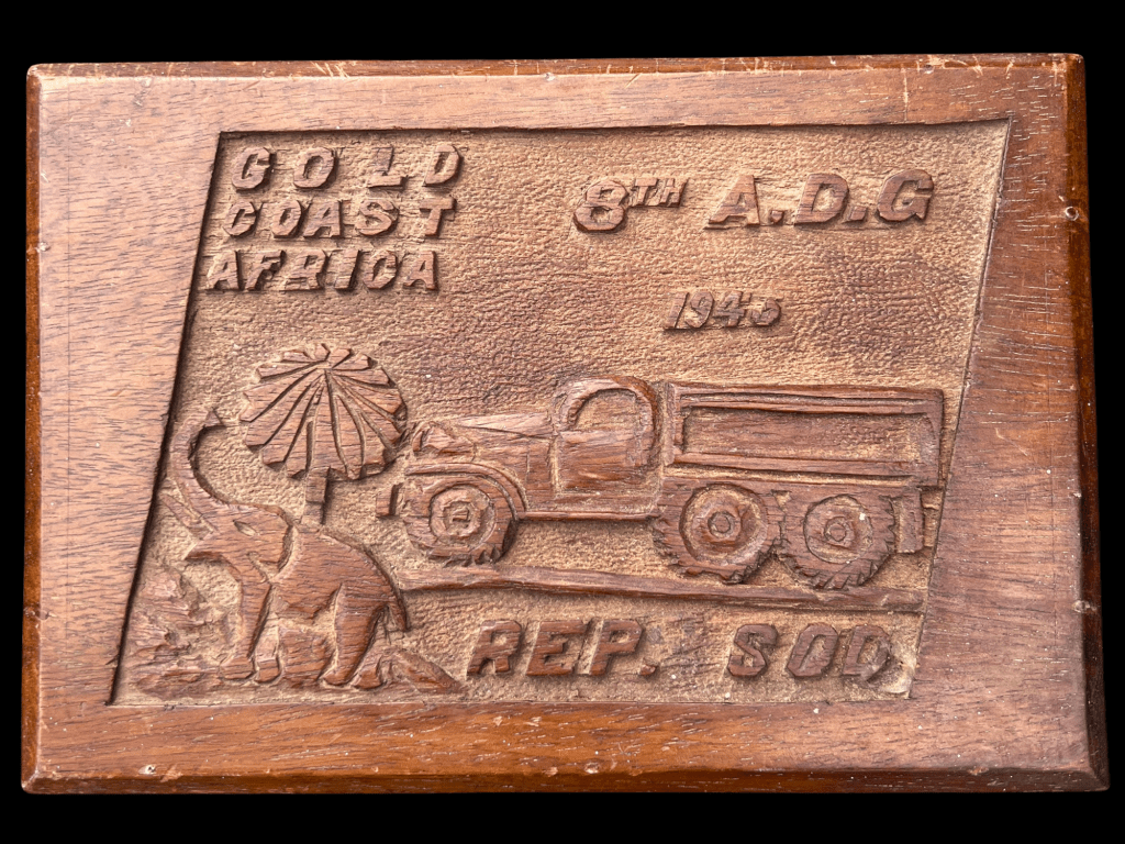 Original World War II hand-carved trench art jewelry box created by a member of the 8th Air Depot Group, 1945, Repair Squadron. The box features detailed carvings of elephants, palm trees, and a 2.5-ton truck, reflecting the unit’s equipment and theater of operations. Accompanying the box are two custom-made silver elephant rings matched to the artwork on the box.