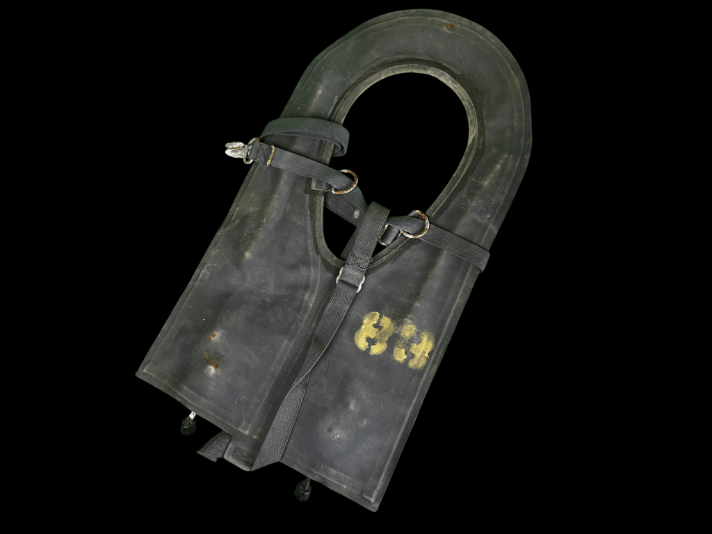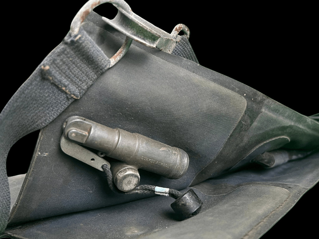 Original World War II-era U.S. Navy and Marine Corps Mae West life jacket, issued to aviators and naval personnel for emergency flotation. These jackets were named “Mae West” for their distinctive inflated shape when worn and were a standard piece of survival gear throughout the war. This example features markings that may indicate it was manufactured by Surfer Atwood, one of several wartime contractors producing life jackets for the U.S. military.