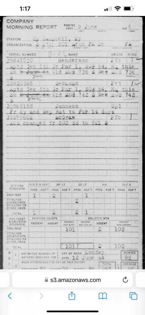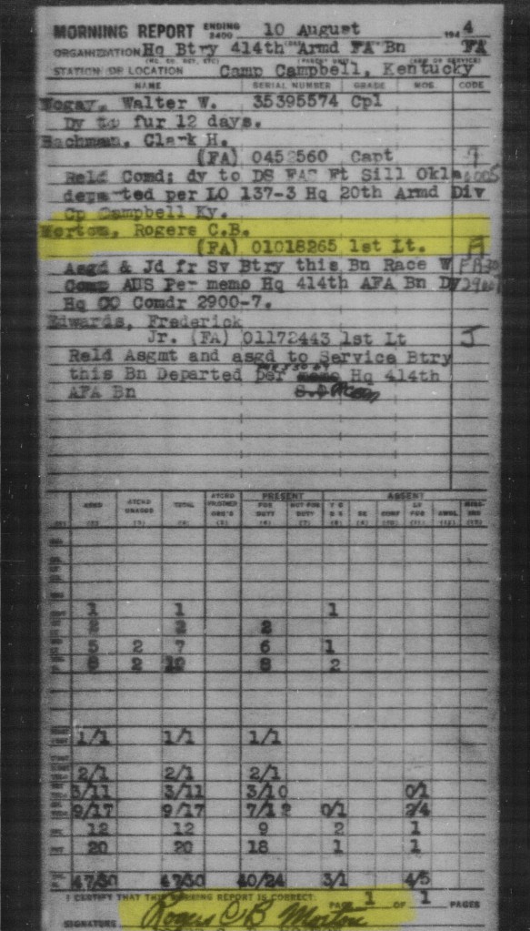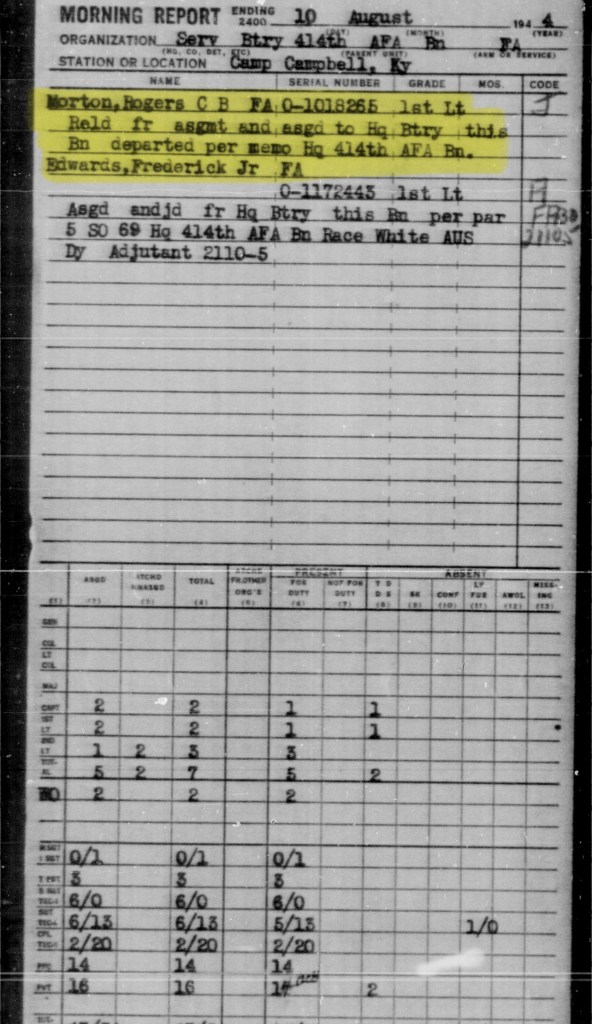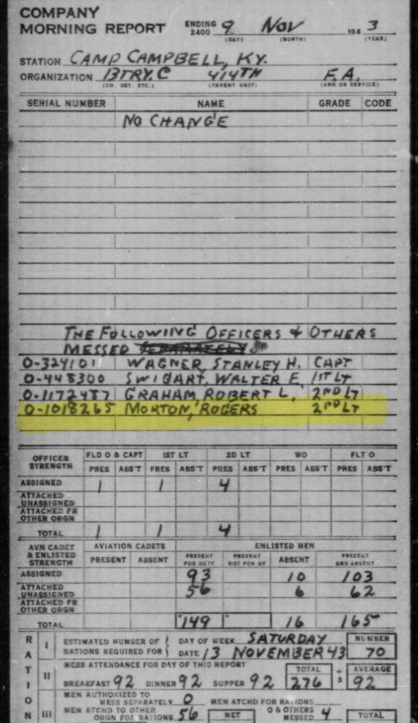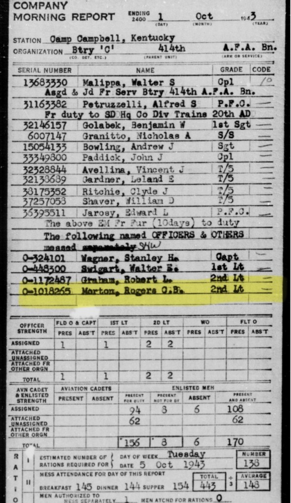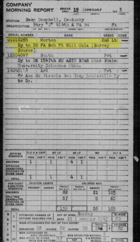 On December 13, 1942, Morton enlisted in the Army and, as a private with college experience, began field artillery training at Officer Candidate School (OCS), Fort Knox, Kentucky. He graduated as a 2nd Lieutenant and appeared on the morning report of October 1, 1943, at Camp Campbell, Kentucky, with Battery C, 414th Field Artillery Battalion. Morton spent much of the war stateside at Camp Campbell, serving in various batteries of the 414th, including Battery C, Service Battery, and Headquarters Battery.
